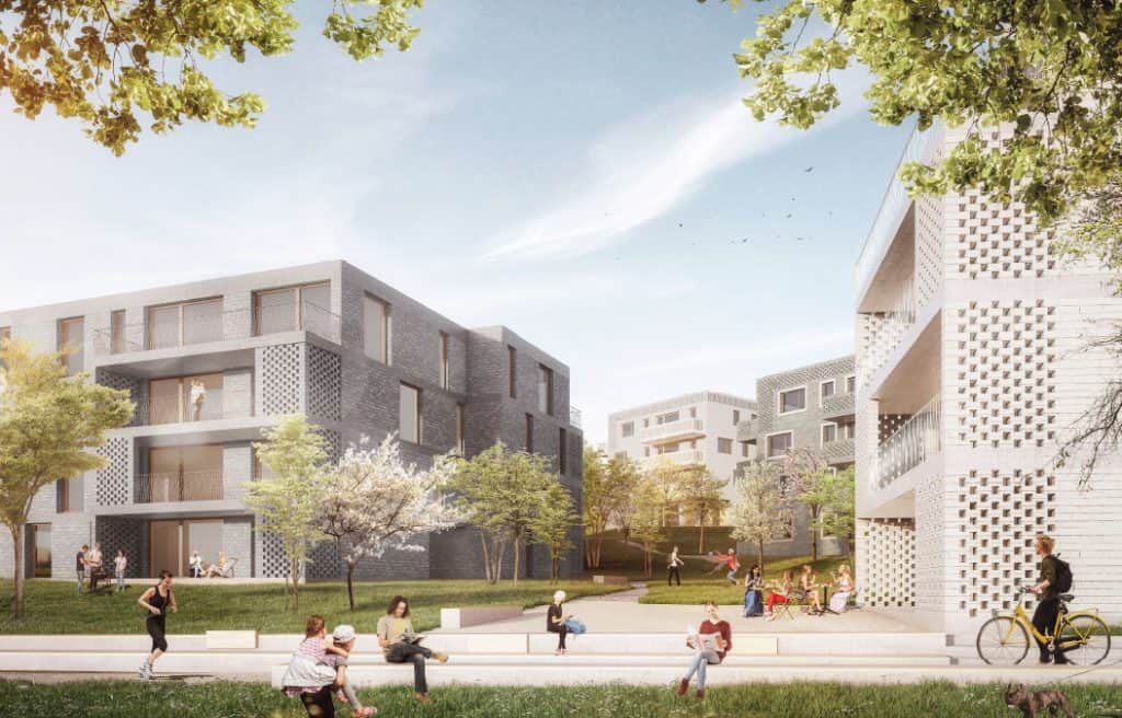 Die fünf geplanten Gebäudekörper orientieren sich frei an den topographischen Gegebenheiten und sind auf die jeweiligen Bezüge zu den umgebenden Grünräumen optimiert. Die Klinkerfassaden setzen sich in fein abgestuften Farbnuancen voneinander ab und verleihen dem Quartier einen besonderen Charme.